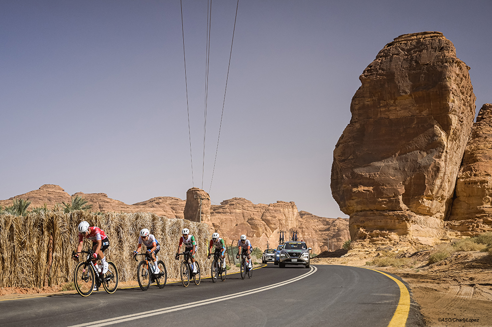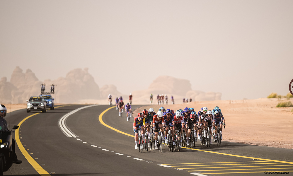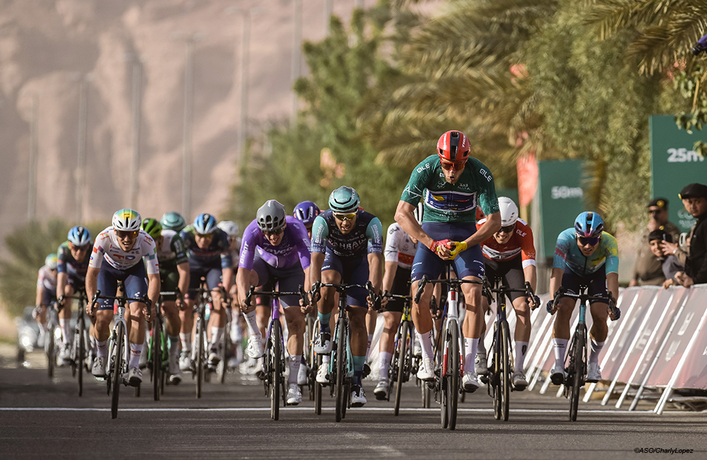It was another wind swept day at the AlUla Tour and despite non stop action and echelons throughout this second stage, a group of around 50 riders remained together for an impressive bunched sprint by the AlManshiyah Train Station. Perfectly led out by his Lidl-Trek partners, Jonathan Milan once again showed what a powerful sprinter he was. The Italian flew to a second consecutive stage success, beating compatriot Daniel Skerl (Bahrain Victorious) and Pascal Ackermann (Team Jayco AlUla) to the line. Milan comforts his overall leadership.