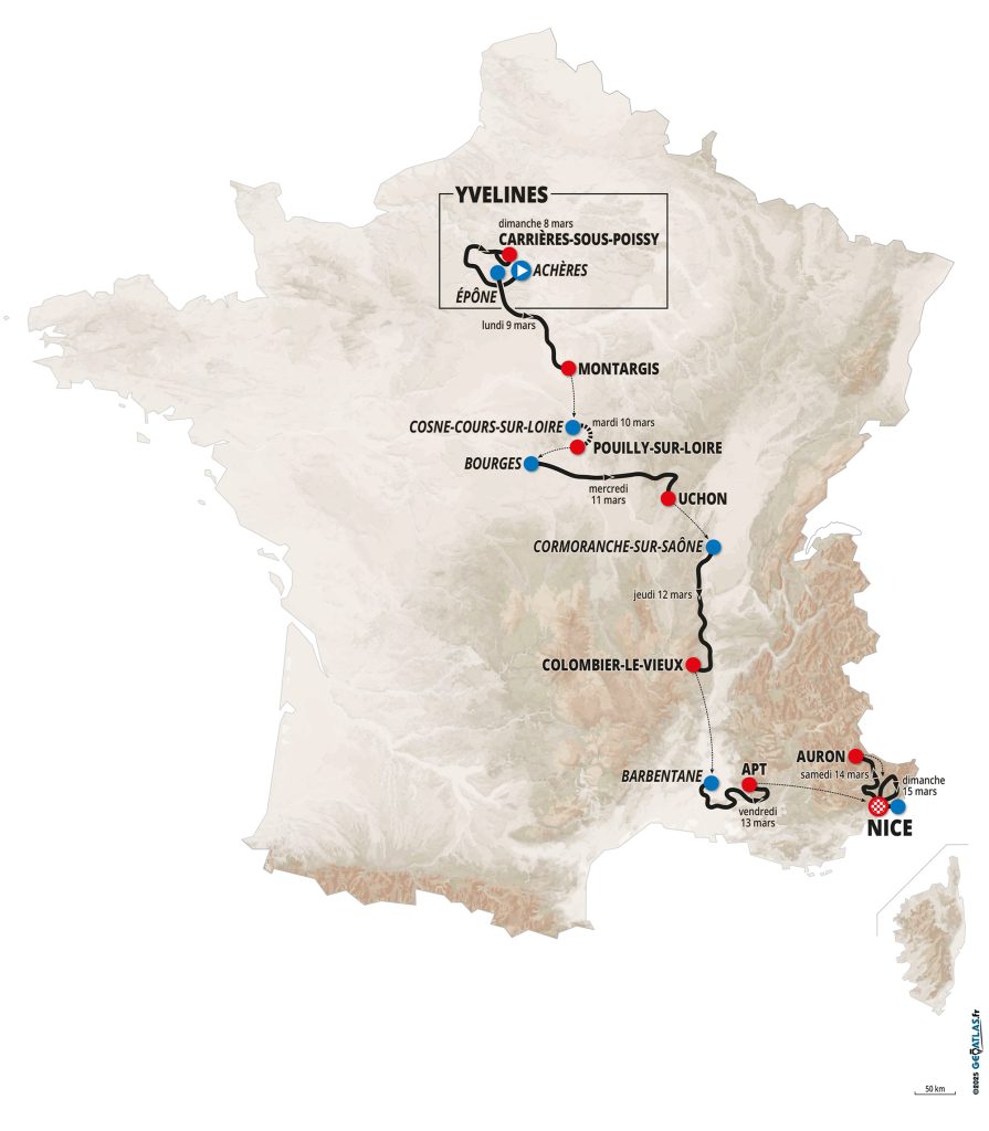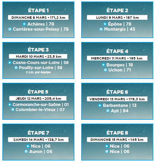 The peloton will set off on Sunday, March 8th from Achères, a first-time host city for the race, and will reach Nice one week later after overcoming the usual challenges: sprints, crosswinds, a team time trial, hills and major climbs.