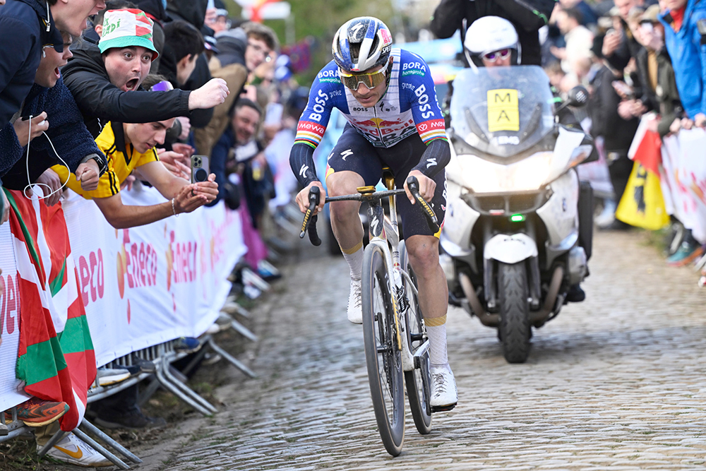 Remco covered the final 50 kilometres on his own. As they tackled the Paterberg for the first time, Pogacar and Mathieu van der Poel – with whom Remco was still riding at that point – made the most of their experience on the cobbles. For a long time, he was only a few seconds behind the leading duo, before the gap eventually widened slightly.