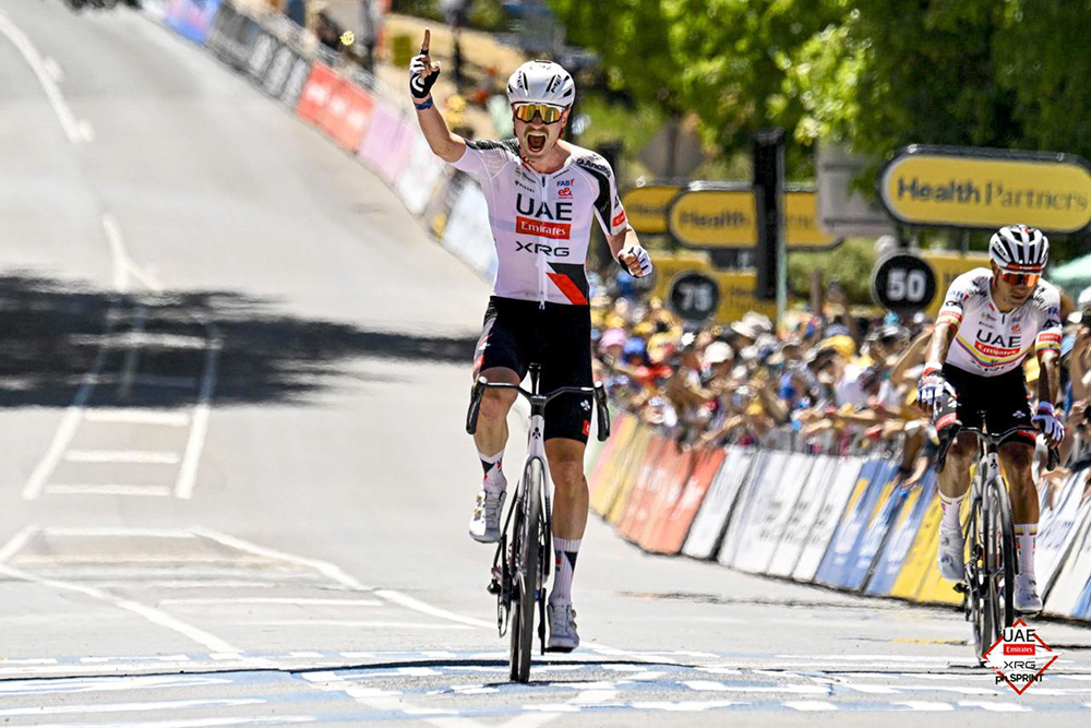 Jay Vine delivered a powerful ride today to claim victory on Stage 2 of the Santos Tour Down Under, leading a decisive UAE Team Emirates-XRG one-two with teammate Jhonatan Narváez on the key uphill finish at Uraidla.